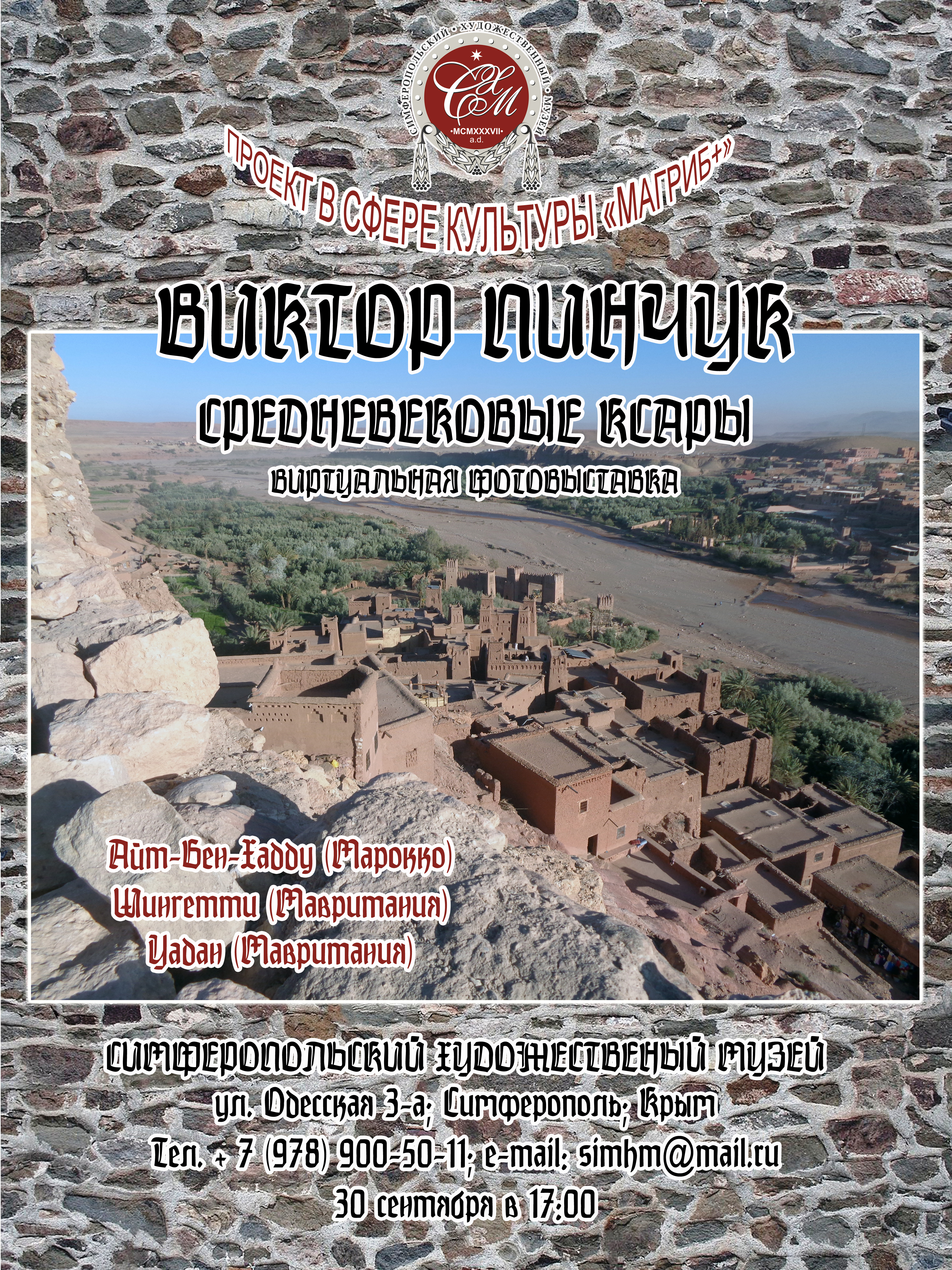 «Средневековые ксары» — виртуальная/цифровая фотовыставка, объединившая три объекта древней архитектуры берберов: Айт-Бен-Хадду в Марокко, Уадан и Шингетти в Мавритании. Материал отснят весной текущего года во время четырехмесячной поездки по африканскому континенту, основной целью которой являлась популяризация российской культуры среди локального населения посредством фотовыставок и творческих встреч.